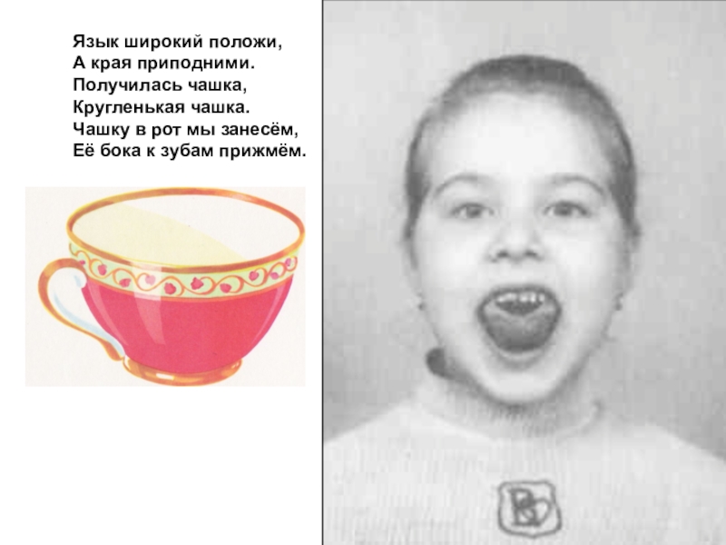 Язык широкий положи,А края приподними.Получилась чашка,Кругленькая чашка.Чашку в рот мы занесём,Её бока к зубам прижмём.