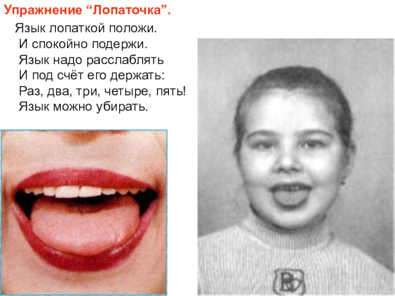 Упражнение “Лопаточка”.  Язык лопаткой положи. И спокойно подержи. Язык надо расслаблять И под счёт его держать: