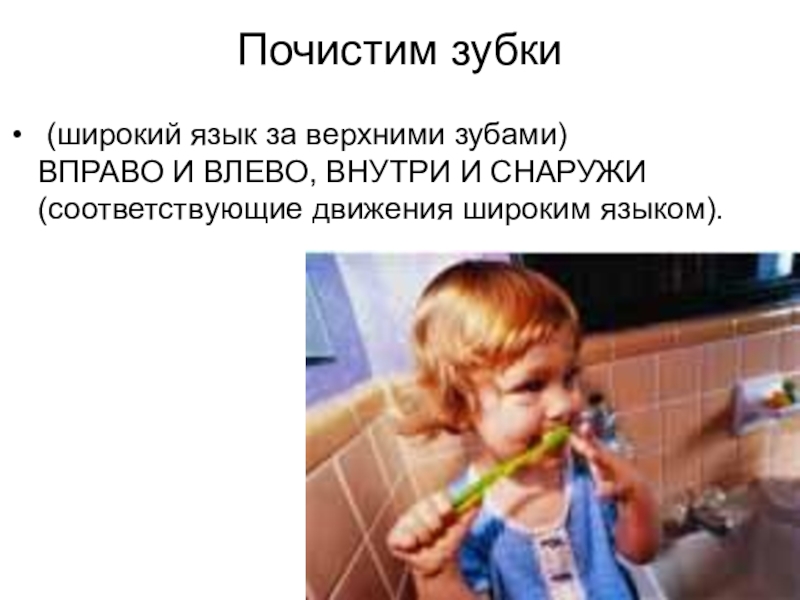 Почистим зубки (широкий язык за верхними зубами)  ВПРАВО И ВЛЕВО, ВНУТРИ И СНАРУЖИ (соответствующие движения широким языком).