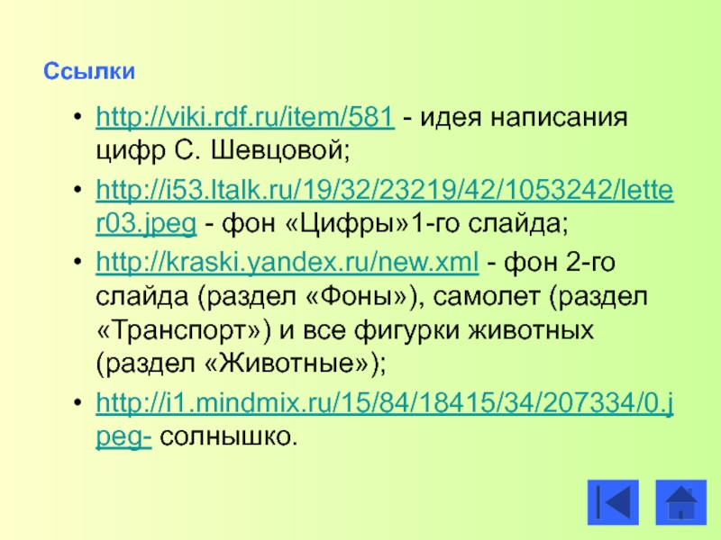 Ссылки http://viki.rdf.ru/item/581 - идея написания цифр С. Шевцовой;http://i53.ltalk.ru/19/32/23219/42/1053242/letter03.jpeg - фон «Цифры»1-го слайда;http://kraski.yandex.ru/new.xml - фон 2-го слайда (раздел