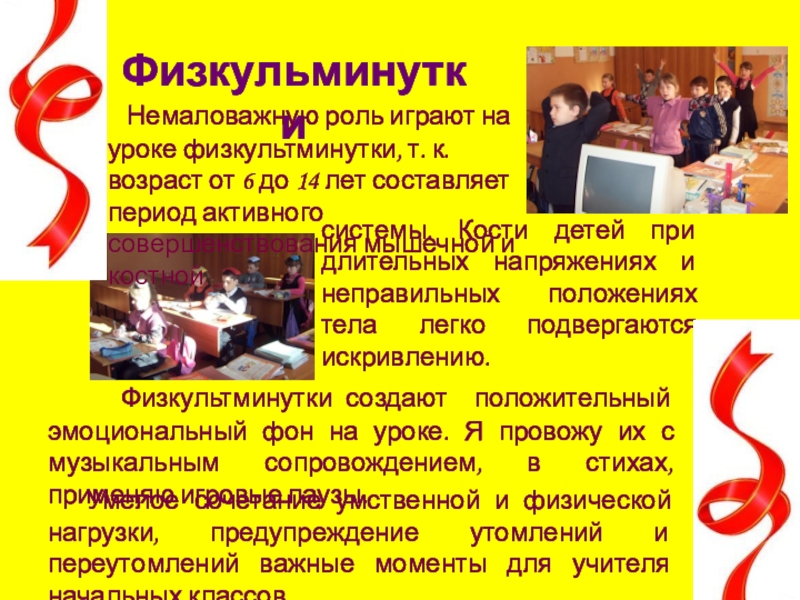 Немаловажную роль играют на уроке физкультминутки, т. к. возраст от 6 до 14 лет составляет период активного совершенствования мышечной и костной