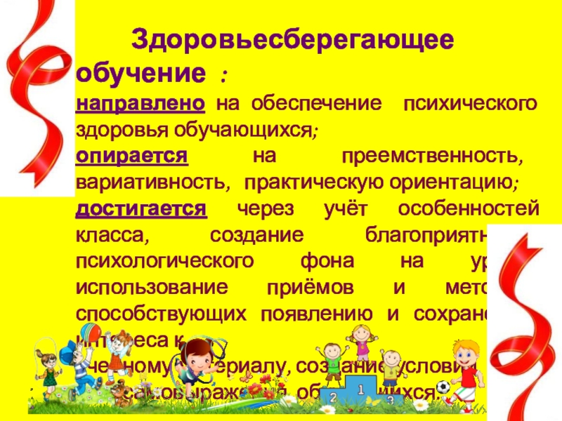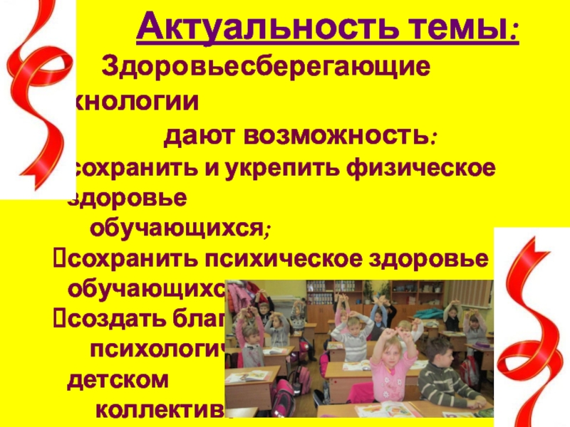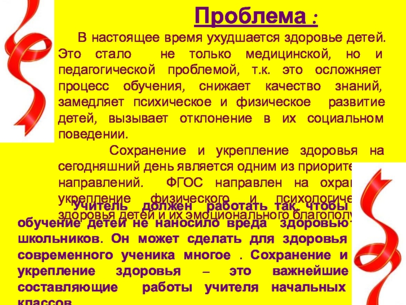 Учитель должен работать так, чтобы обучение детей не наносило вреда здоровью школьников. Он может сделать для здоровья современного ученика многое . Сохранение и укрепление здоровья – это важнейшие составляющие работы учителя начальных классов.
