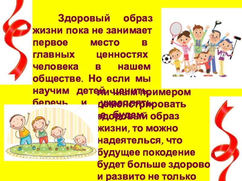 личным примером демонстрировать здоровый образ жизни, то можно надеятелься, что будущее покодение будет больше здорово и развито не только духовно, но и физически.