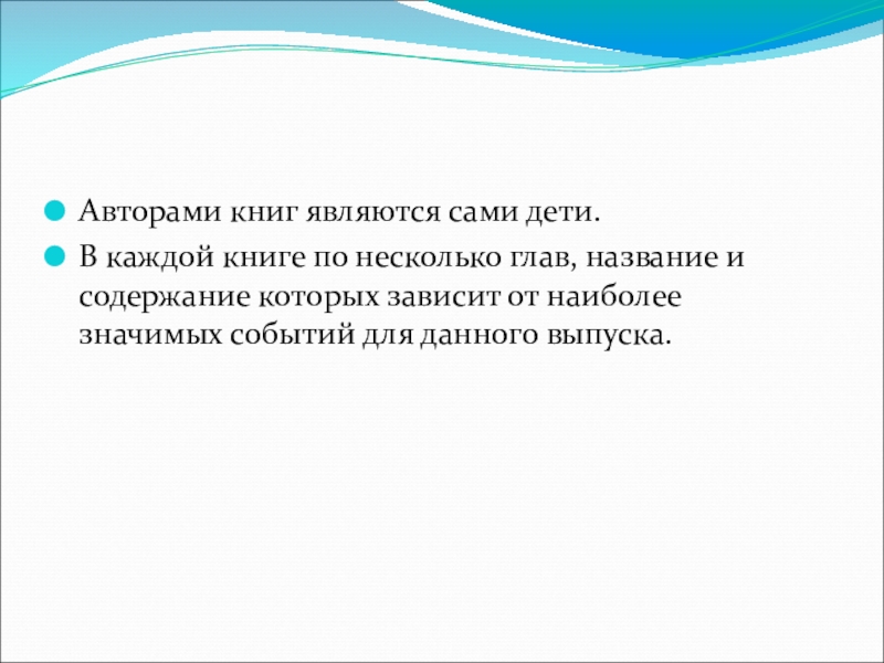 Авторами книг являются сами дети.В каждой книге по несколько глав, название и содержание которых зависит от наиболее