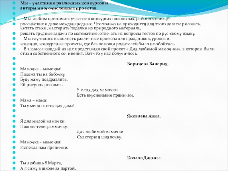 В 3 классе каждый из нас представлял свой проект « Для любимой мамоч-ки», в котором были стихи собственного сочинения. Вот что у нас получи-лось.
