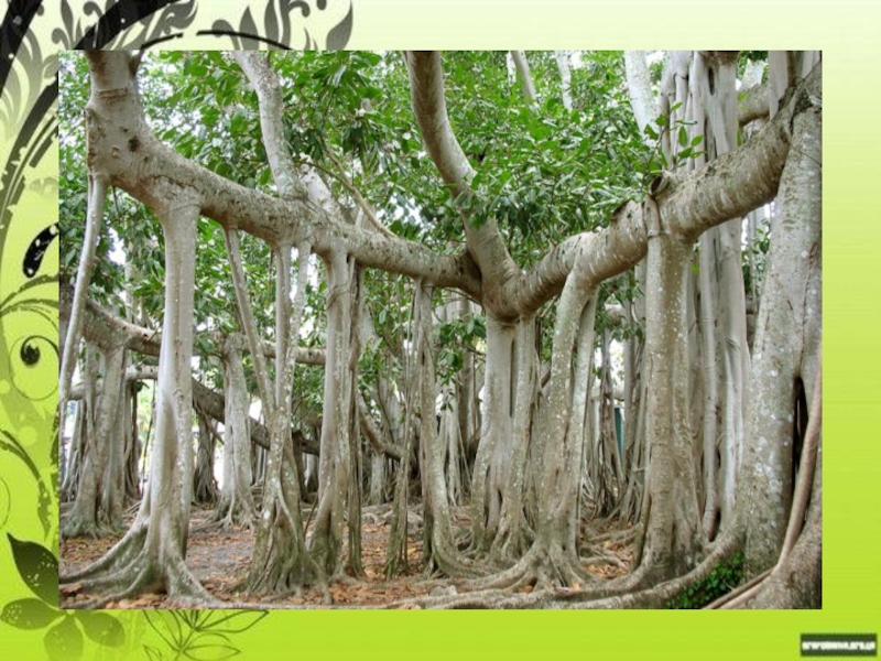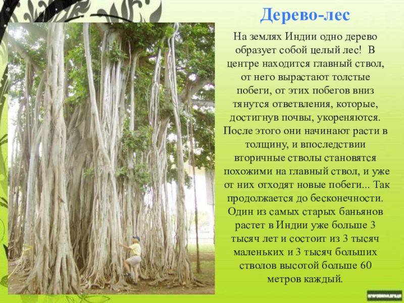 находится главный ствол, от него вырастают толстые побеги, от этих побегов вниз тянутся ответвления, которые, достигнув почвы, укореняются. После этого они начинают расти в толщину, и впоследствии вторичные стволы становятся похожими на главный ствол, и уже от них отходят новые побеги... Так продолжается до бесконечности. Один из самых старых баньянов растет в Индии уже больше 3 тысяч лет и состоит из 3 тысяч маленьких и 3 тысяч больших стволов высотой больше 60 метров каждый.