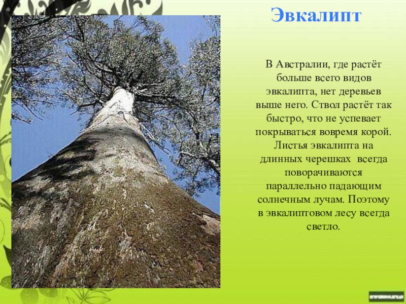 него. Ствол растёт так быстро, что не успевает покрываться вовремя корой. Листья эвкалипта на длинных черешках всегда поворачиваются параллельно падающим солнечным лучам. Поэтому в эвкалиптовом лесу всегда светло.