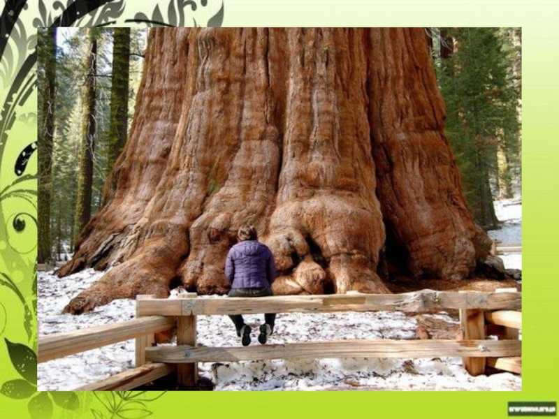 10 метров. Живёт это дерево очень долго, три, четыре тысячи лет. Его древесина не гниёт , и это было одной из причин уничтожения этих деревьев. Сейчас осталось всего 500 таких деревьев. Их охраняют, им даже дают свои имена. Например, «Отец лесов», «Генерал Шерман».