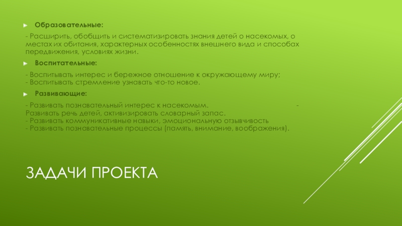- Расширить, обобщить и систематизировать знания детей о насекомых, о