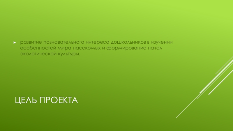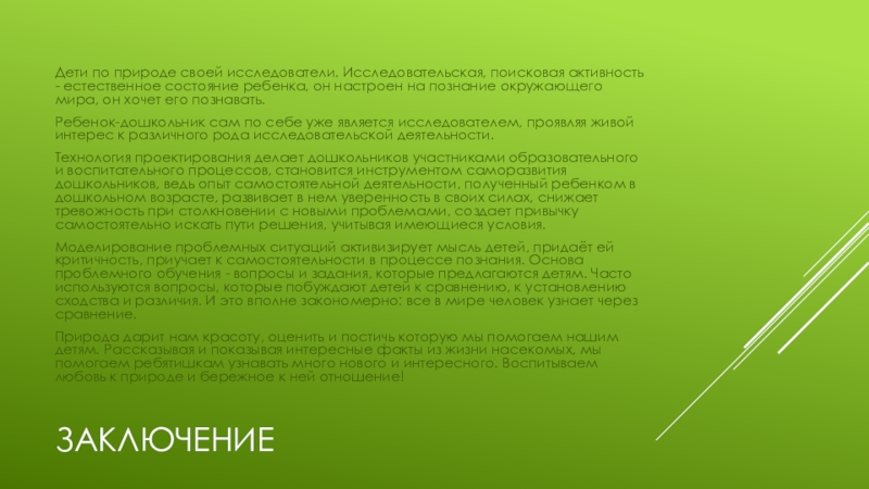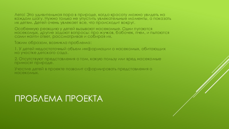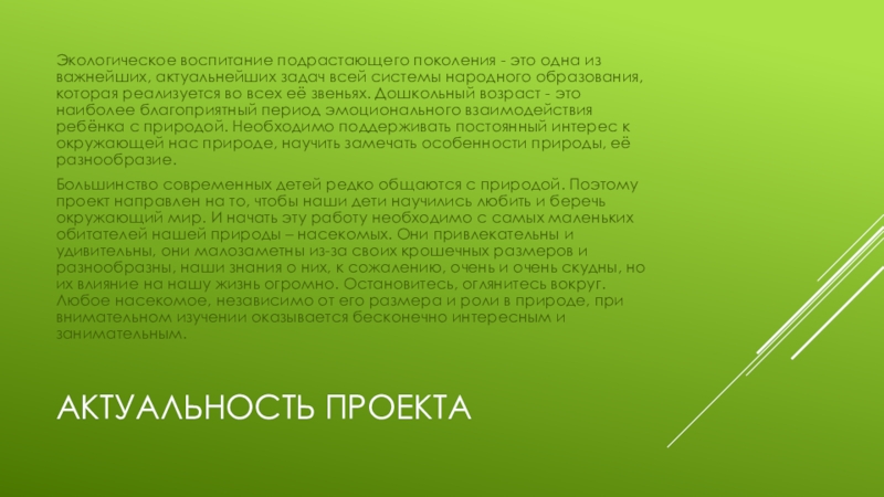 Большинство современных детей редко общаются с природой. Поэтому проект направлен на то, чтобы наши дети научились любить и беречь окружающий мир. И начать эту работу необходимо с самых маленьких обитателей нашей природы – насекомых. Они привлекательны и удивительны, они малозаметны из-за своих крошечных размеров и разнообразны, наши знания о них, к сожалению, очень и очень скудны, но их влияние на нашу жизнь огромно. Остановитесь, оглянитесь вокруг. Любое насекомое, независимо от его размера и роли в природе, при внимательном изучении оказывается бесконечно интересным и занимательным.