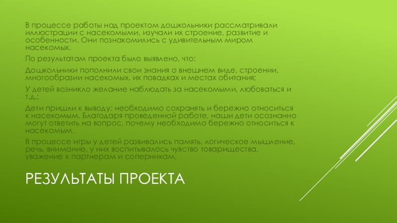 Дошкольники пополнили свои знания о внешнем виде, строении, многообразии насекомых, их повадках и местах обитания;