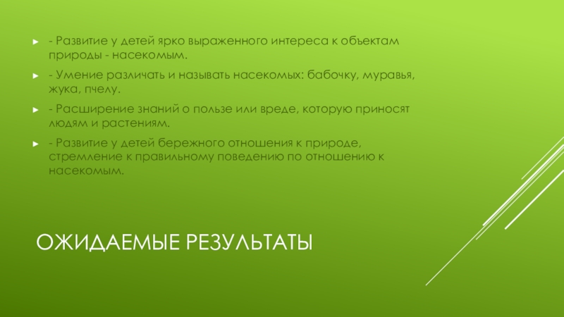 - Развитие у детей бережного отношения к природе, стремление к правильному поведению по отношению к насекомым.