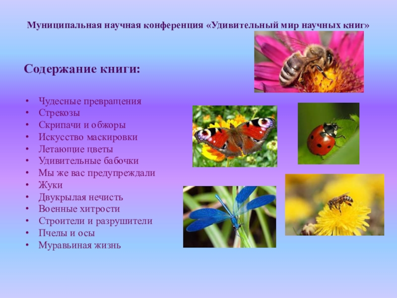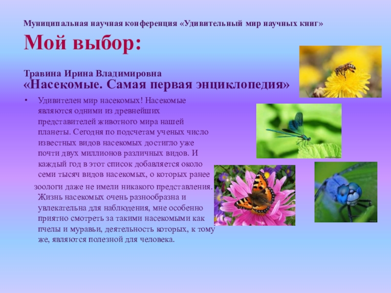 зоологи даже не имели никакого представления. Жизнь насекомых очень разнообразна и увлекательна для наблюдения, мне особенно приятно смотреть за такими насекомыми как пчелы и муравьи, деятельность которых, к тому же, являются полезной для человека.