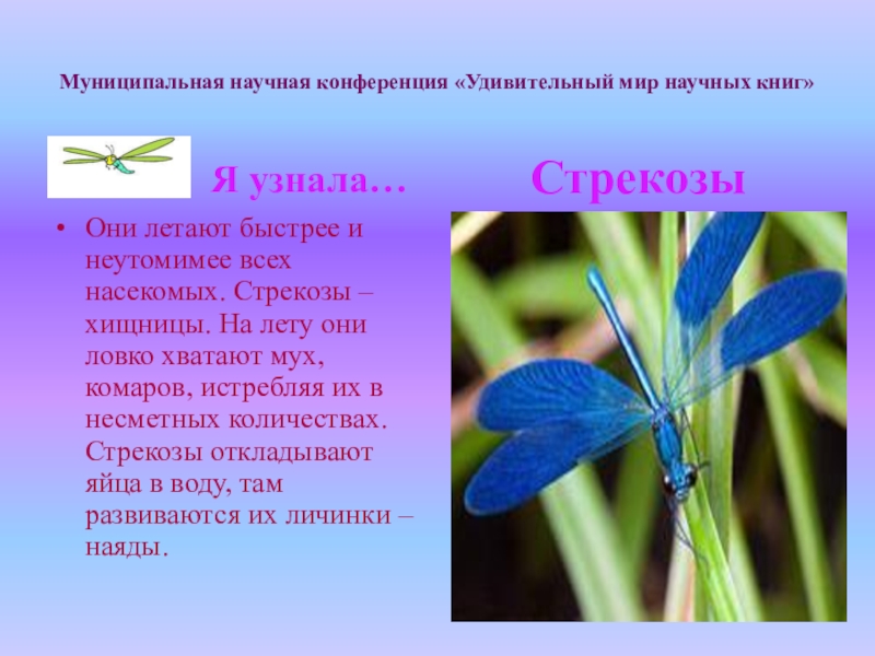Они летают быстрее и неутомимее всех насекомых. Стрекозы – хищницы. На лету они ловко хватают мух, комаров, истребляя их в несметных количествах. Стрекозы откладывают яйца в воду, там развиваются их личинки – наяды.