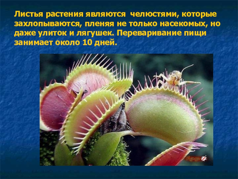 Слайд 12Листья растения являются челюстями, которые захлопываются, пленяя не только насекомых, но