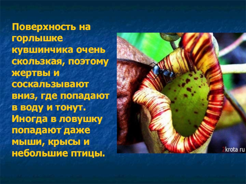 Поверхность на горлышке кувшинчика очень скользкая, поэтому жертвы и соскальзывают вниз, где попадают в воду
