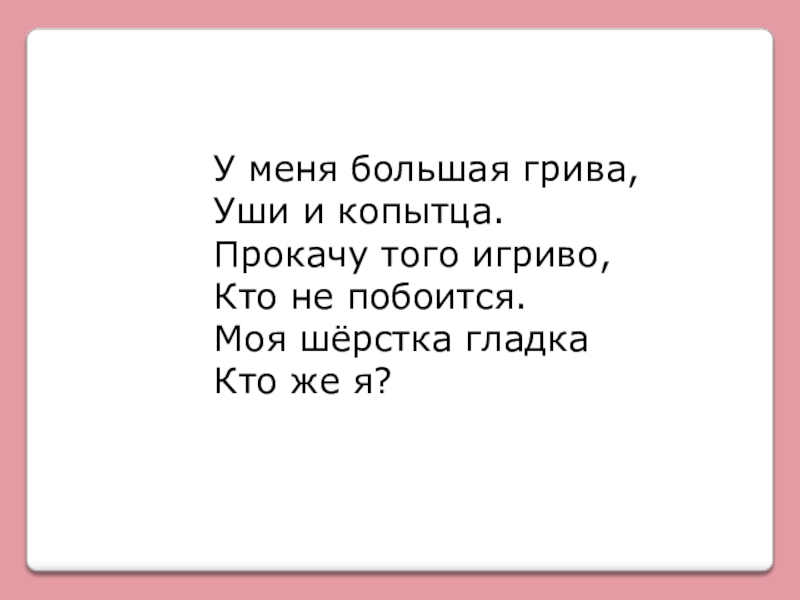 У меня большая грива,Уши и копытца.Прокачу того игриво,Кто не побоится.Моя шёрстка гладкаКто же я?