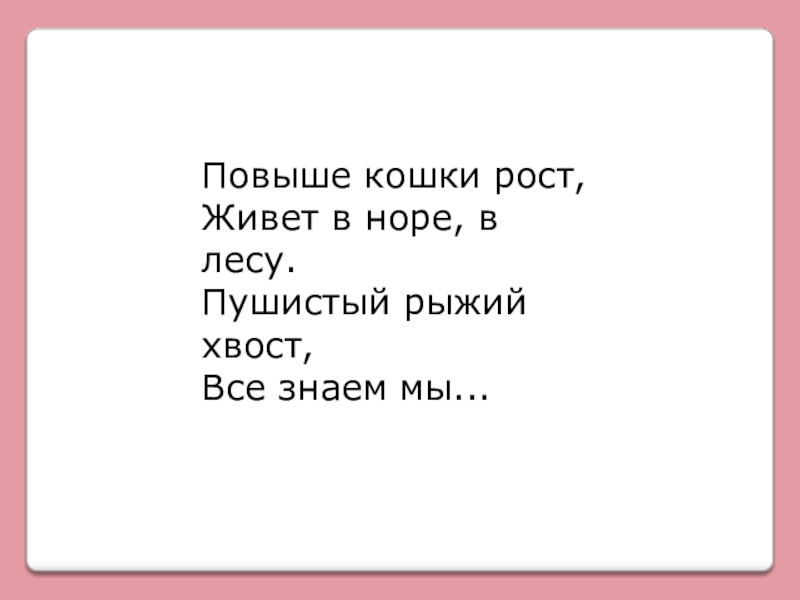 Слайд 2Повыше кошки рост, Живет в норе, в лесу. Пушистый рыжий хвост, Все знаем мы...