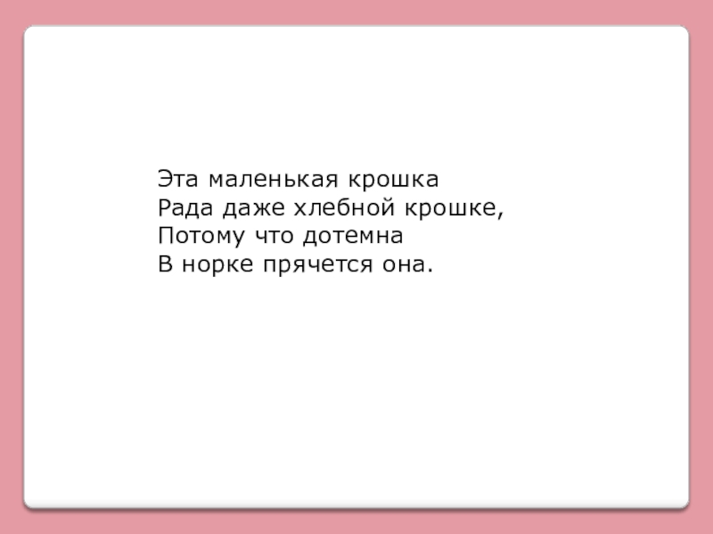 Слайд 29Эта маленькая крошка  Рада даже хлебной крошке,  Потому что дотемна  В норке прячется она.
