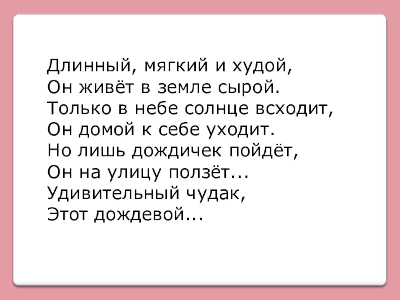 Слайд 8Длинный, мягкий и худой, Он живёт в земле сырой. Только в небе солнце