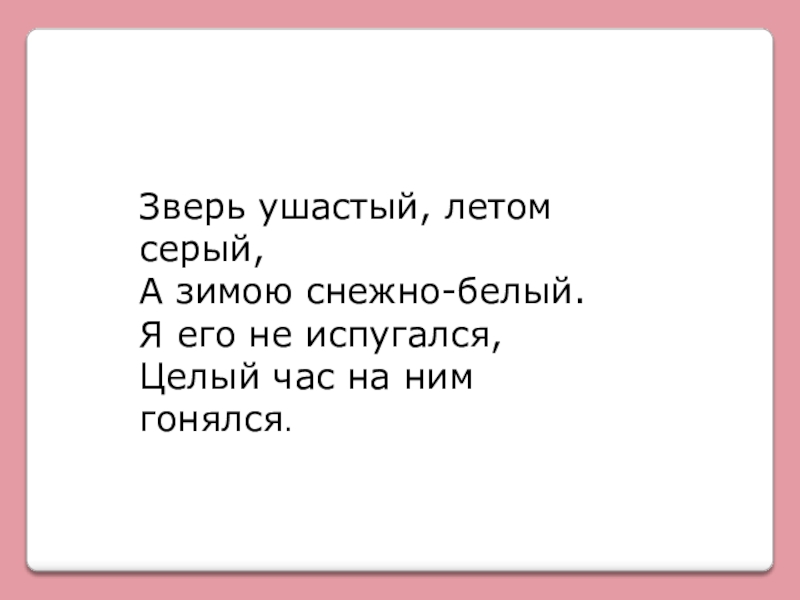 Слайд 16Зверь ушастый, летом серый, А зимою снежно-белый. Я его не испугался, Целый час на