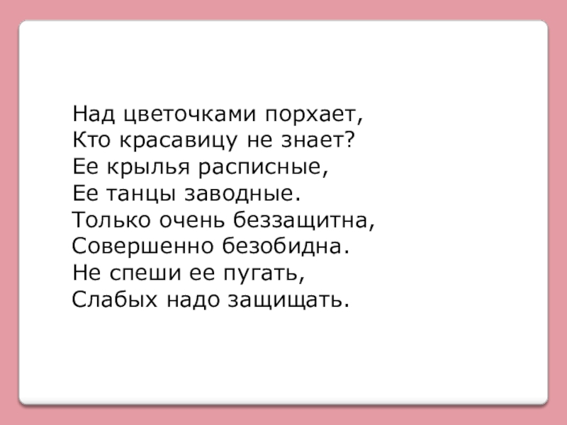 Над цветочками порхает, Кто красавицу не знает? Ее крылья расписные, Ее танцы заводные. Только очень беззащитна, Совершенно