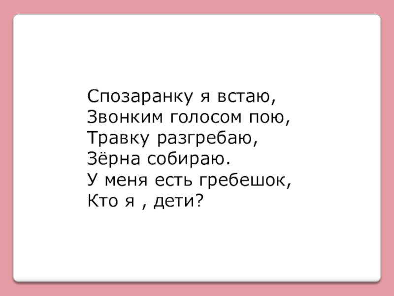Спозаранку я встаю, Звонким голосом пою,Травку разгребаю,Зёрна собираю.У меня есть гребешок, Кто я , дети?