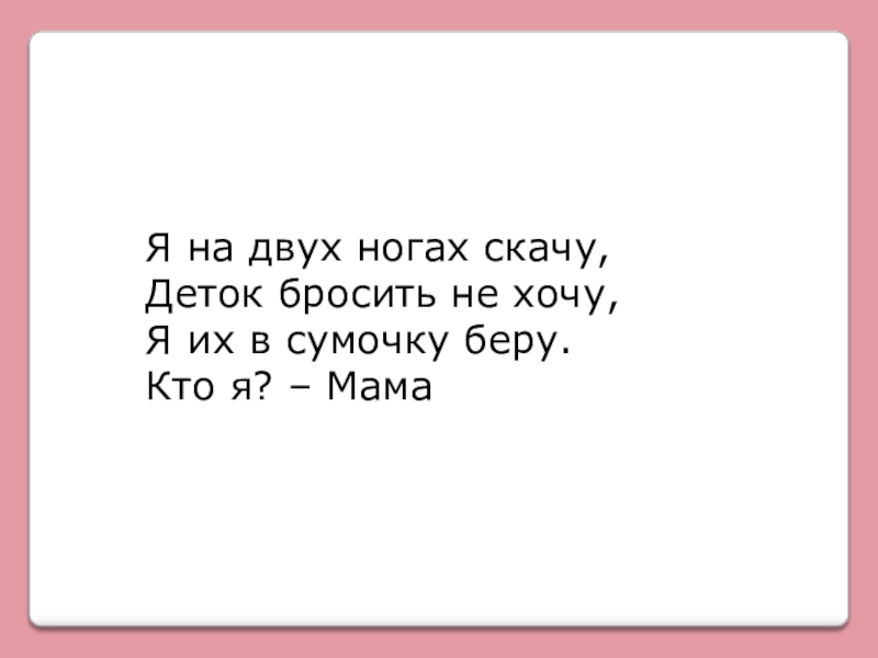Слайд 6Я на двух ногах скачу, Деток бросить не хочу, Я их в сумочку