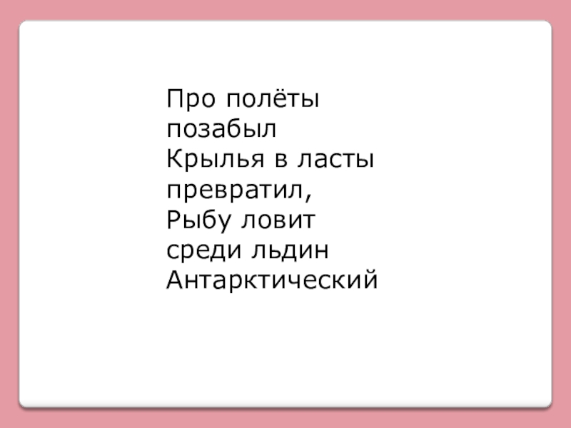 Про полёты позабылКрылья в ласты превратил,Рыбу ловит среди льдинАнтарктический