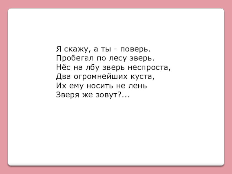 Слайд 14Я скажу, а ты - поверь. Пробегал по лесу зверь. Нёс на лбу