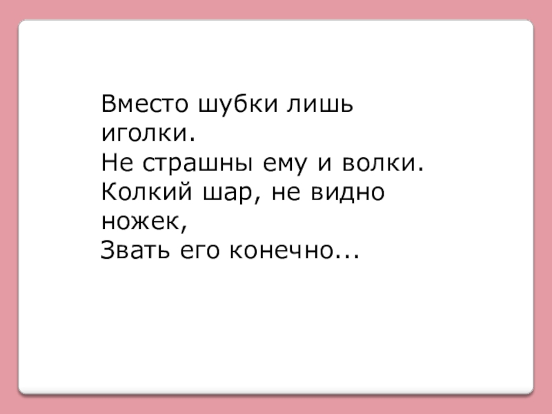 Слайд 12Вместо шубки лишь иголки. Не страшны ему и волки. Колкий шар, не видно