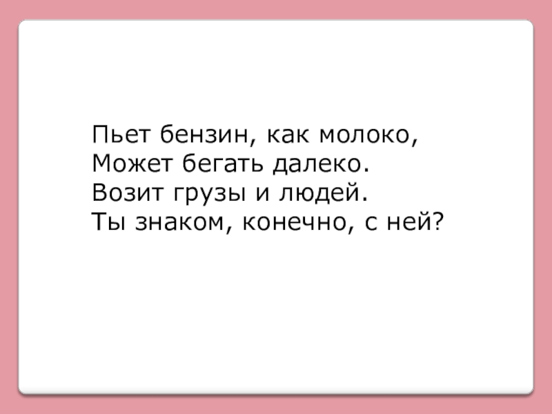 Слайд 31Пьет бензин, как молоко, Может бегать далеко. Возит грузы и людей. Ты знаком, конечно,