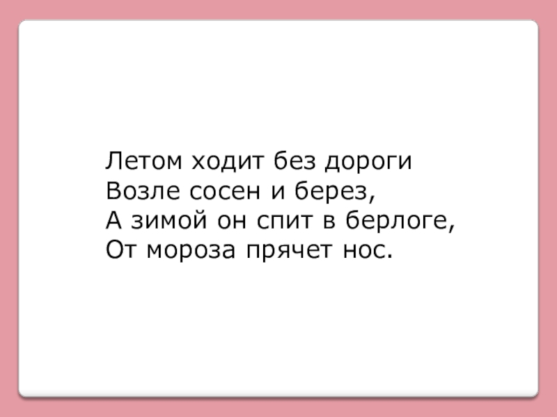 Слайд 22Летом ходит без дороги Возле сосен и берез, А зимой он спит в