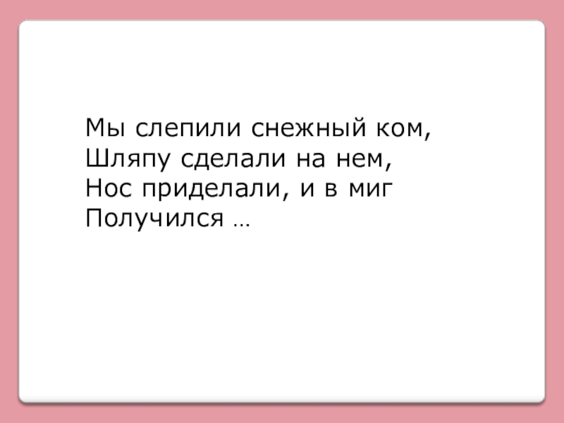 Мы слепили снежный ком,  Шляпу сделали на нем,  Нос приделали, и в миг  Получился …