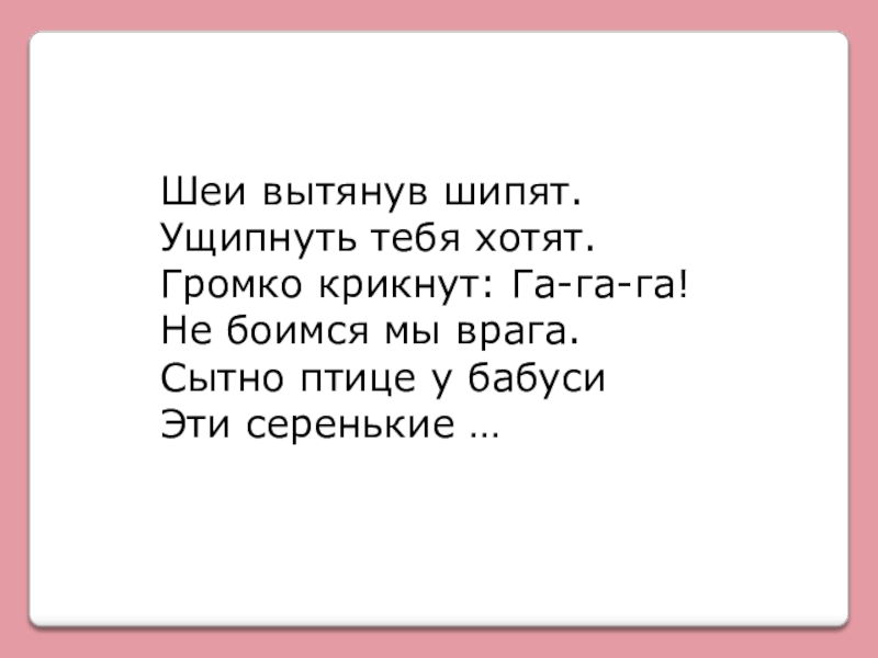 Слайд 4Шеи вытянув шипят. Ущипнуть тебя хотят. Громко крикнут: Га-га-га! Не боимся мы врага. Сытно птице