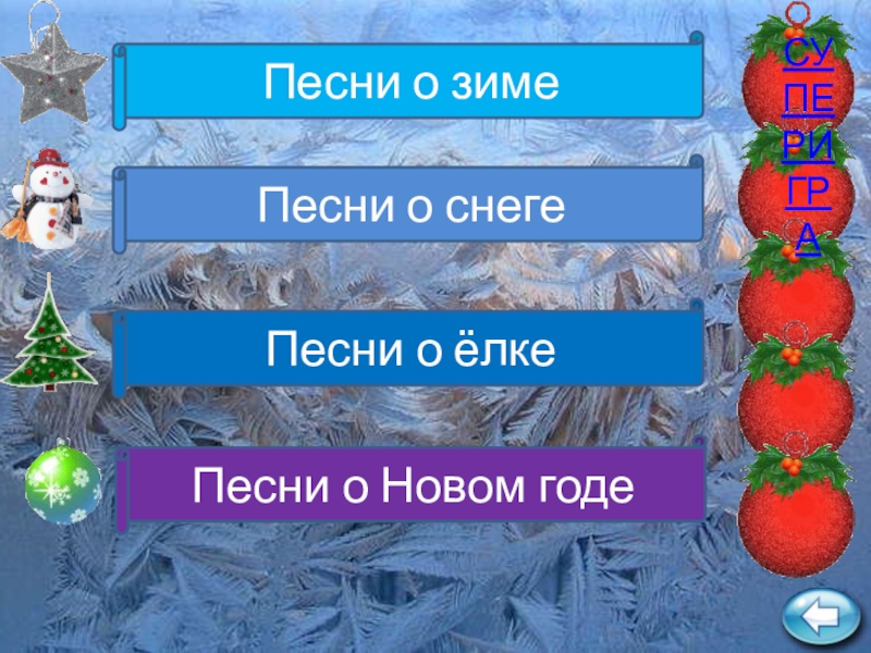 СУПЕРИГРАПесни о зимеПесни о снегеПесни о ёлкеПесни о Новом годе