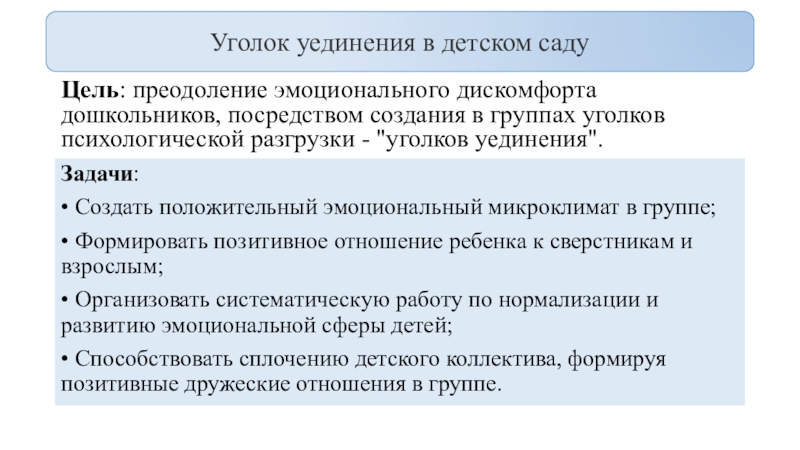 Цель: преодоление эмоционального дискомфорта дошкольников, посредством создания в группах уголков психологической разгрузки - "уголков уединения".