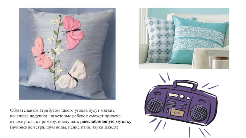 Слайд 17Обязательным атрибутом такого уголка будут мягкие, красивые подушки, на которые ребенок
