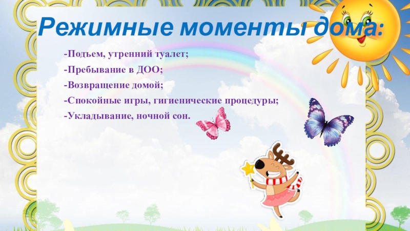 Режимные моменты дома:-Подъем, утренний туалет;-Пребывание в ДОО;-Возвращение домой;-Спокойные игры, гигиенические процедуры;-Укладывание, ночной сон.