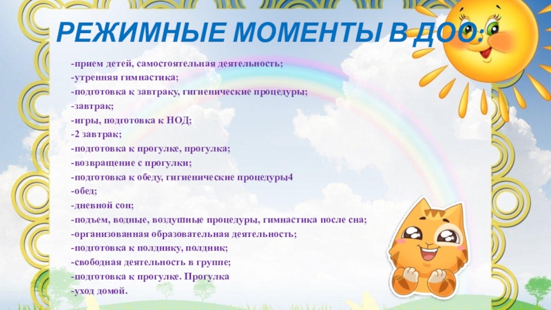 РЕЖИМНЫЕ МОМЕНТЫ В ДОО:-прием детей, самостоятельная деятельность;-утренняя гимнастика;-подготовка к завтраку, гигиенические процедуры;-завтрак;-игры, подготовка к НОД;-2 завтрак;-подготовка к прогулке, прогулка;-возвращение с прогулки;-подготовка к обеду, гигиенические процедуры4-обед;-дневной сон;-подъем, водные, воздушные процедуры, гимнастика после сна;-организованная образовательная деятельность;-подготовка к полднику,