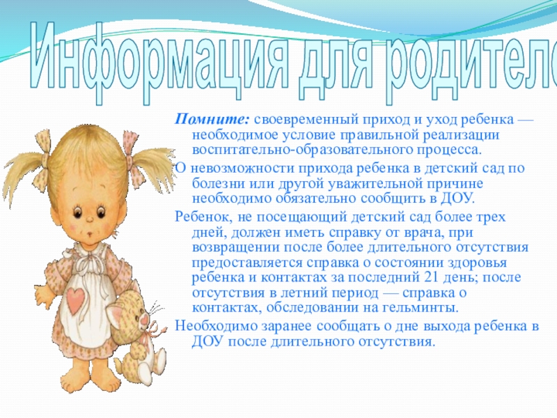 Информация для родителейПомните: своевременный приход и уход ребенка — необходимое условие правильной реализации воспитательно-образовательного процесса.О невозможности прихода ребенка