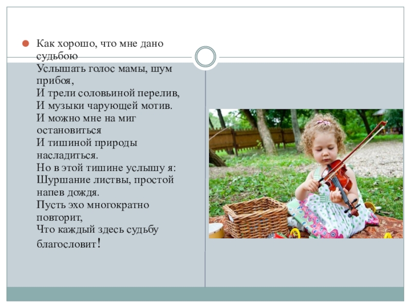 Как хорошо, что мне дано судьбою Услышать голос мамы, шум прибоя, И трели соловьиной перелив, И музыки
