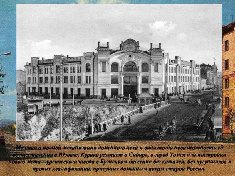 осуществления в Юзовке, Курако уезжает в Сибирь, в город Томск для постройки нового металлургического завода в Кузнецком бассейне без каталей, без чугунщиков и прочих квалификаций, присущих доменным цехам старой России.