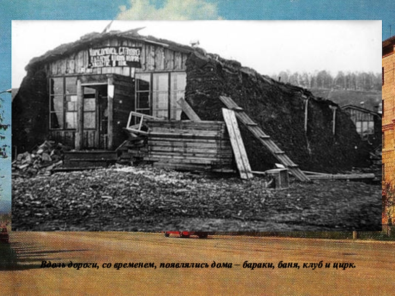 Слайд 8Вдоль дороги, со временем, появлялись дома – бараки, баня, клуб и