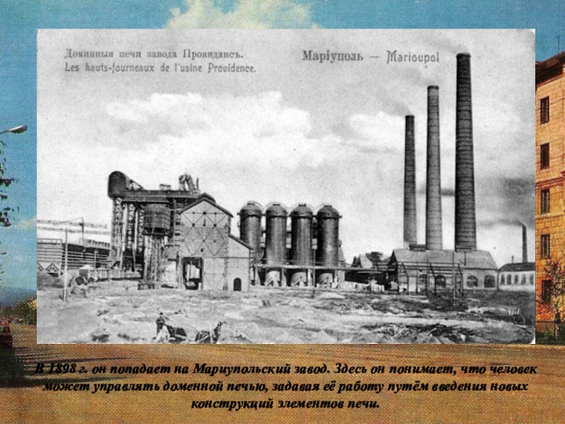 Слайд 19В 1898 г. он попадает на Мариупольский завод. Здесь он понимает,