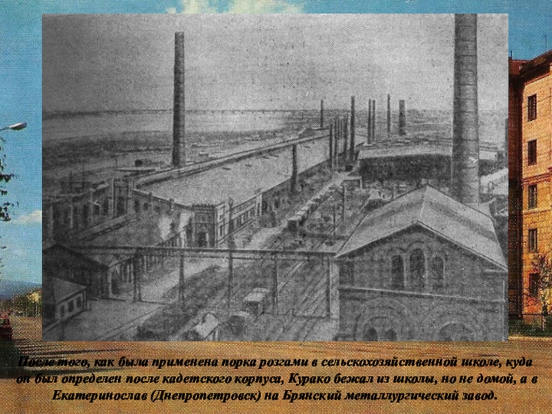 он был определен после кадетского корпуса, Курако бежал из школы, но не домой, а в Екатеринослав (Днепропетровск) на Брянский металлургический завод.