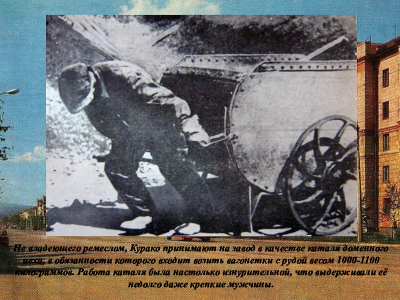 Слайд 16Не владеющего ремеслом, Курако принимают на завод в качестве каталя доменного