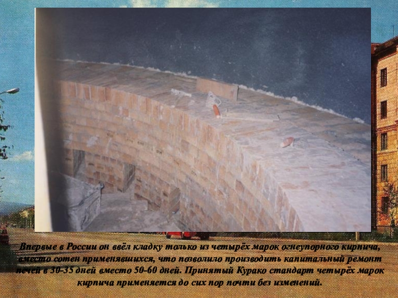 Слайд 22Впервые в России он ввёл кладку только из четырёх марок огнеупорного