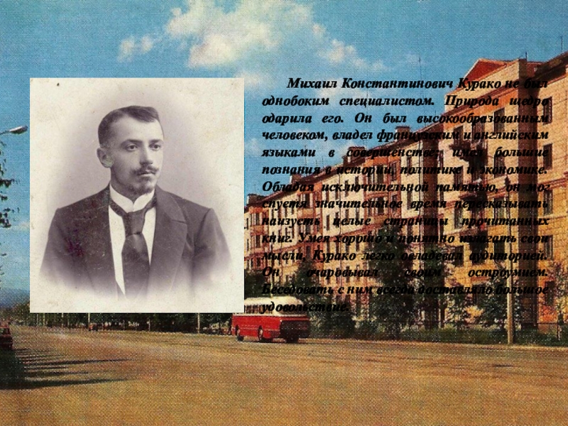 щедро одарила его. Он был высокообразованным человеком, владел французским и английским языками в совершенстве; имел большие познания в истории, политике и экономике. Обладая исключительной памятью, он мог спустя значительное время пересказывать наизусть целые страницы прочитанных книг. Умея хорошо и понятно излагать свои мысли, Курако легко овладевал аудиторией. Он очаровывал своим остроумием. Беседовать с ним всегда доставляло большое удовольствие.