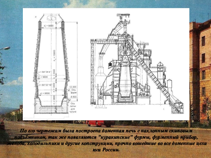 Слайд 21По его чертежам была построена доменная печь с наклонным скиповым подъёмником,